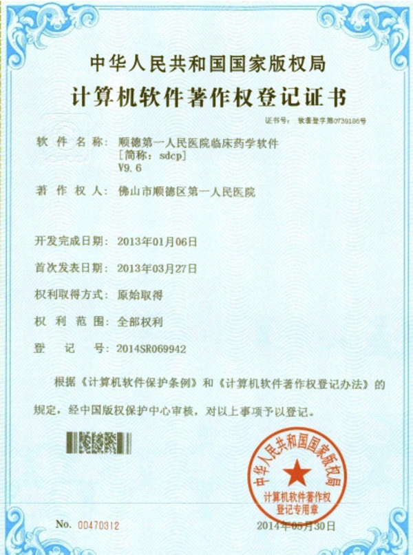 6月9日,我院從中國版權(quán)保護中心接過《計算機軟件著作權(quán)》證書,軟件名稱:順德第一人民醫(yī)院臨床藥學(xué)軟件(簡稱:sdcp),V9.6;著作權(quán)人為:佛山市順德區(qū)第一人民醫(yī)院。 我院此次開...閱讀全文