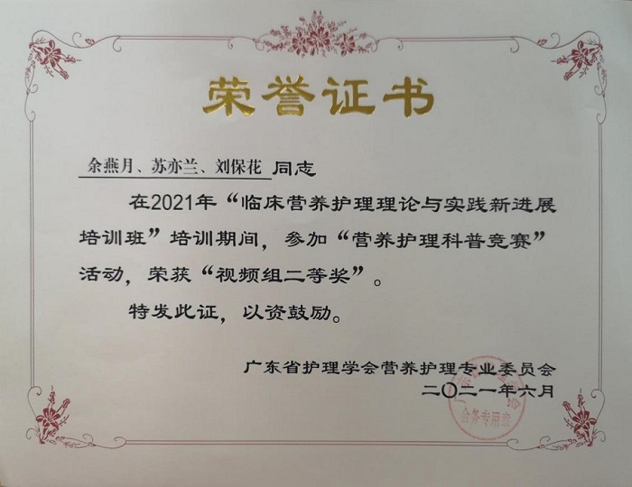 2021-06-24我院獲得省護理學會營養(yǎng)護理科普競賽二等獎