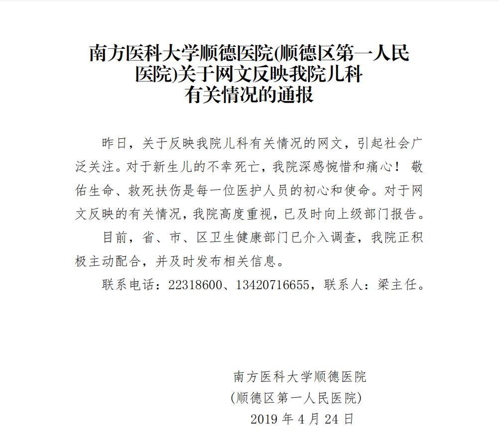 南方醫(yī)科大學(xué)順德醫(yī)院(順德區(qū)第一人民醫(yī)院)關(guān)于網(wǎng)文反映我院兒科有關(guān)情況的通報閱讀全文