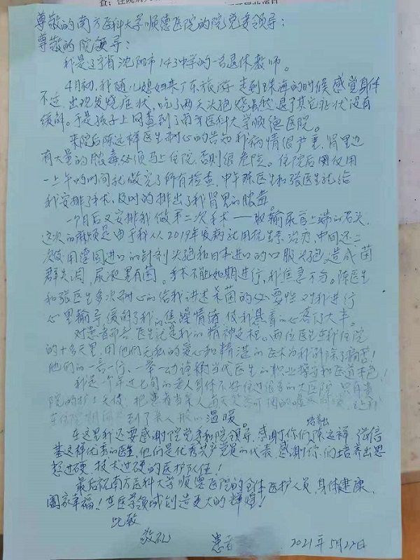 ? ? ? 近日,南方醫(yī)科大學(xué)順德醫(yī)院泌尿外科收到了一封來自千里之外(遼寧沈陽)的感謝信,字里行間溢滿了對泌尿外科醫(yī)務(wù)人員的感謝與信任——“醫(yī)生就是我的精神支柱”“是你們讓我在住院期間感受到了親人般的溫暖”。?? ? ? 旅游期間突發(fā)腎積...閱讀全文