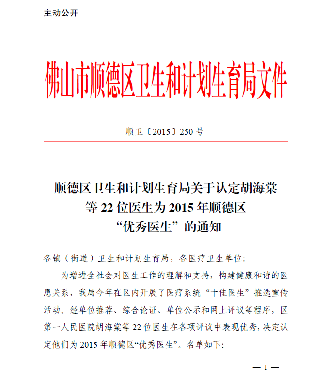 2015-10-06轉發(fā)順德區(qū)衛(wèi)生和計劃生育局關于認定胡海棠等22位醫(yī)生...