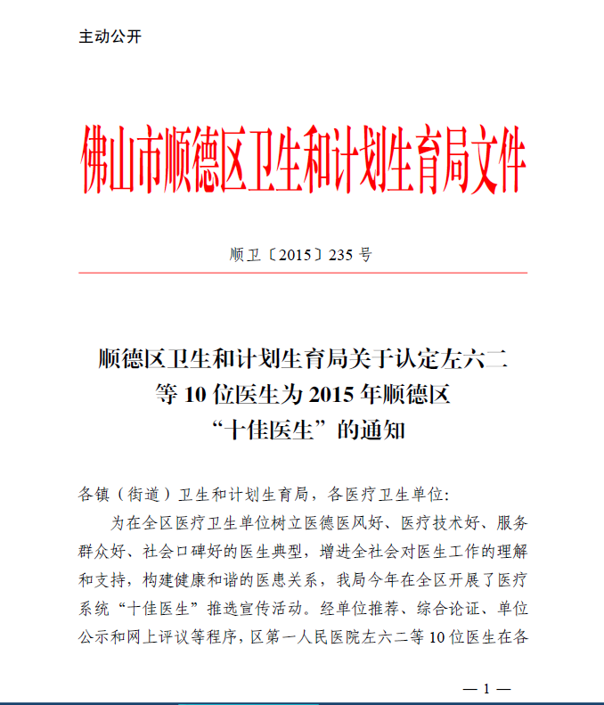2015-10-06轉發(fā)順德區(qū)衛(wèi)生和計劃生育局關于認定左六二等10位醫(yī)生...