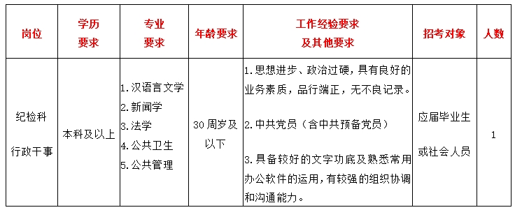 因工作需要,現(xiàn)我院面向社會(huì)招聘1名行政干事。相關(guān)要求如下:崗位學(xué)歷要求專(zhuān)業(yè)要求 年齡要求工作經(jīng)驗(yàn)要求及其他要求招考對(duì)象人數(shù)紀(jì)檢科行政干事本科及以上1.漢語(yǔ)言文學(xué)2.新聞學(xué)3.法學(xué)4.公共衛(wèi)生5.公共管理30周歲及以下1.思想進(jìn)步、政治過(guò)硬...閱讀全文
