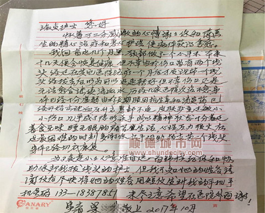 2017-10-26【順德城市網(wǎng)】為表感激,老伯寄出感謝信還送錦旗