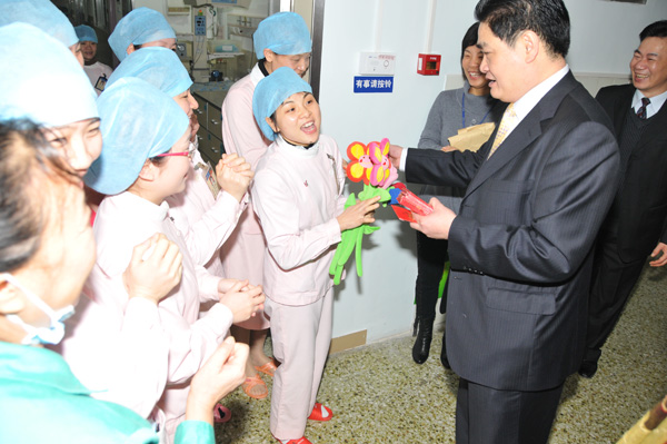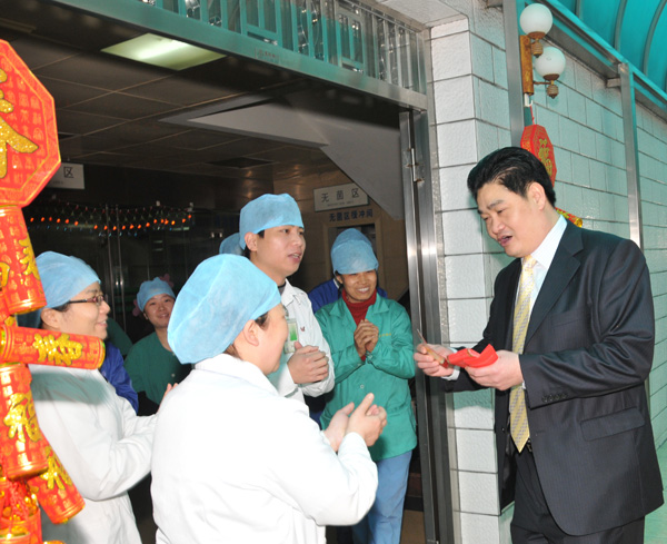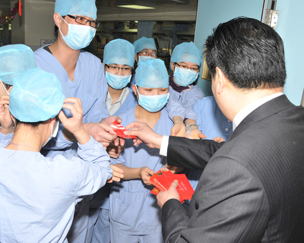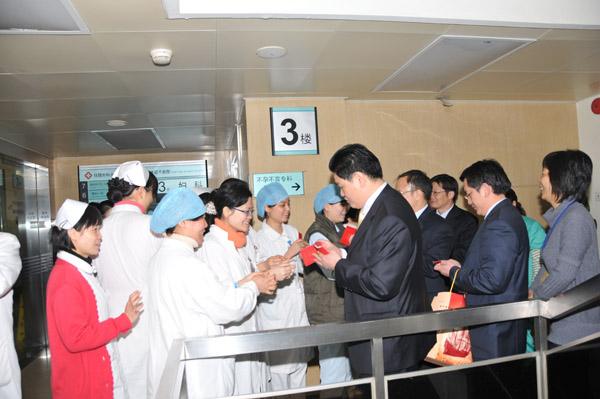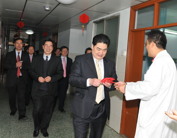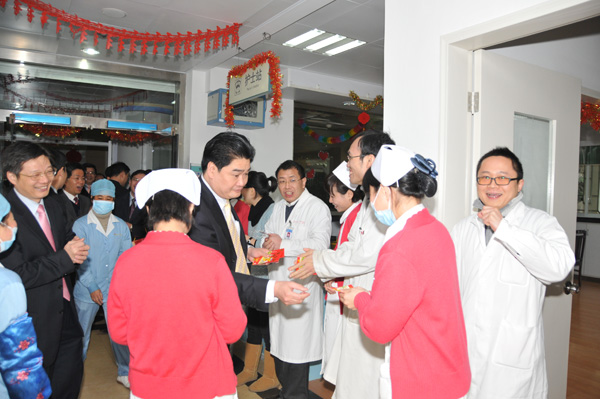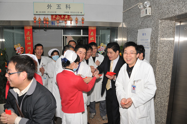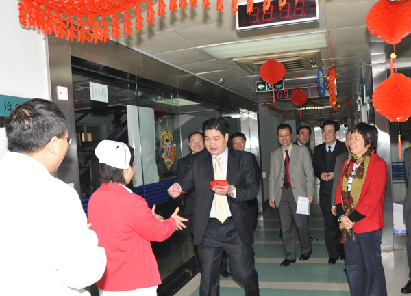 2月14日(大年初一)上午和2月21日(年初八)上午,醫(yī)院黨委書(shū)記、院長(zhǎng)陳小伍以及醫(yī)院黨委副書(shū)記廖玉聯(lián)、副院長(zhǎng)胡允兆、于新發(fā)、錢(qián)江、龍兆麟等全體院領(lǐng)導(dǎo)率各職能科室負(fù)責(zé)人來(lái)到各臨床、醫(yī)技、后勤和職能科室,向員工們進(jìn)行集體拜年。陳小伍院長(zhǎng)代表醫(yī)院向員工們派發(fā)了新年利事,為員工們送去了新年美好的祝福,把醫(yī)院的關(guān)懷送到了每一位員工的心中。每到一個(gè)科室,院領(lǐng)導(dǎo)與員工們相互祝福,恭賀新年的到來(lái),共同祝愿新年美好的前景、祝愿虎年醫(yī)院再創(chuàng)輝煌,歡笑聲響徹了醫(yī)院的每一個(gè)角落。歡聲笑語(yǔ)中,洋溢著幸福,充滿了和諧,沸騰著喜悅,憧憬著希望!院領(lǐng)導(dǎo)與員工們用祝福拉開(kāi)了虎年的序幕、用歡笑銓釋了虎年的希望!
