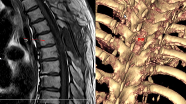 輔助檢查:術(shù)前胸椎MRI可見胸5-6水平椎管內(nèi)占位病變