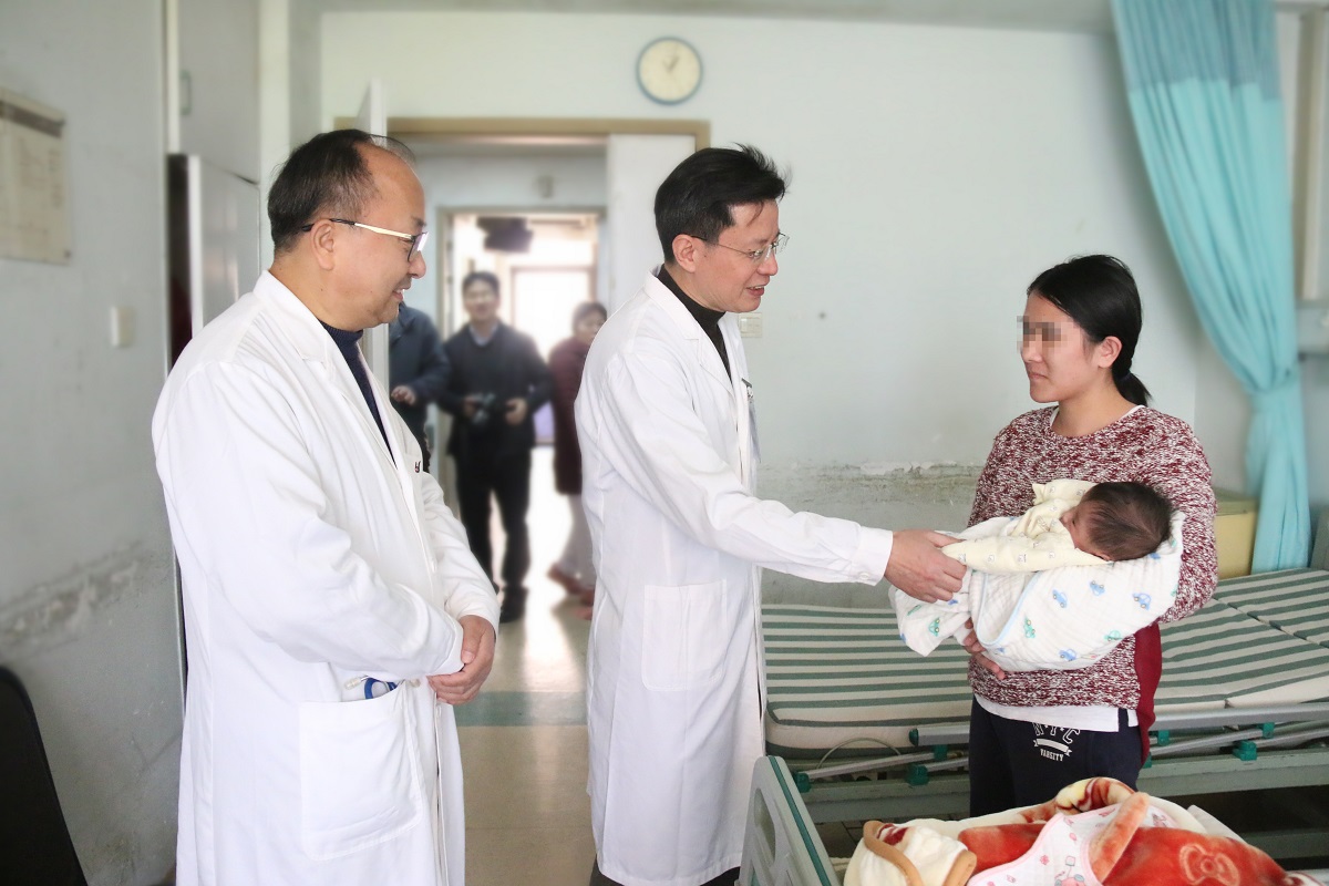 醫(yī)院院長(zhǎng)劉瑞林(中)在王曉黎教授的陪同下看望即將出院的小楹。