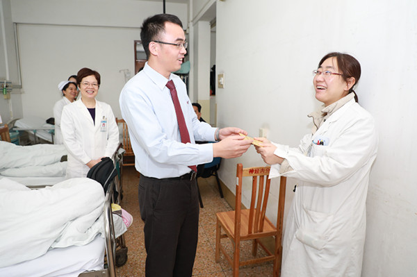 ? ? ? ? 為了不斷增強(qiáng)全院職工的獲得感,讓職工感受醫(yī)院的溫暖和關(guān)懷,經(jīng)醫(yī)院職工代表會議表決和黨政聯(lián)席會議決定,從2018年起每月向生日的職工贈送生日蛋糕卡一張,讓他們到指定蛋糕店憑卡選購糕點,歡度生日。1月5日是實施這項舉措的第一天,上午9時30分,工會主席廖玉聯(lián)帶領(lǐng)工會所有成員到臨床科室為1月生日的職工送上生日蛋糕卡,并代表醫(yī)院向他們表達(dá)了誠摯的生日祝福。“很驚喜,很感動,想不到醫(yī)院這么貼心,謝謝醫(yī)院?!币晃皇盏缴盏案饪ǖ膯T工感嘆道,臉上洋溢著幸福的笑容。一句句暖心的話語,一次次貼心的問候,讓職工倍感溫暖。