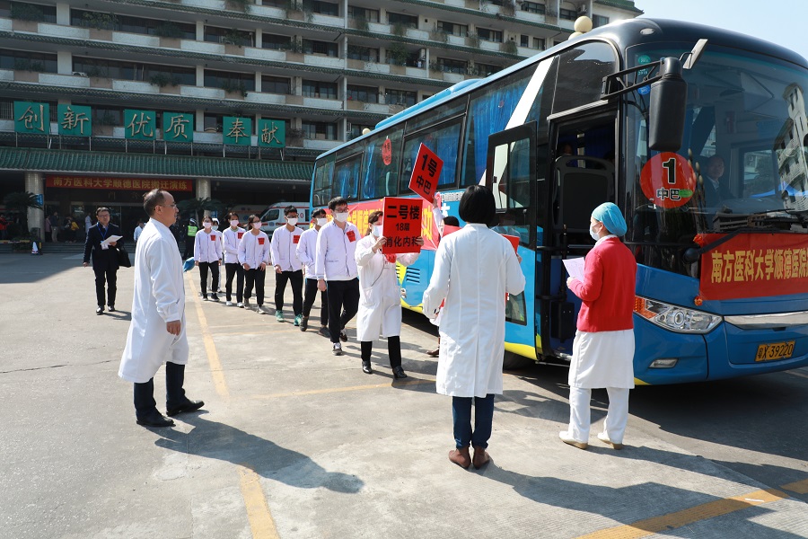 巴士轉(zhuǎn)運病人在醫(yī)護人員的帶領(lǐng)下有序上車。