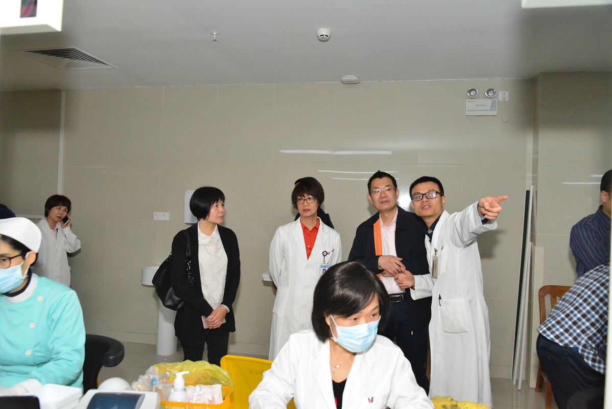 順德區(qū)衛(wèi)計(jì)局副局長(zhǎng)李子慶(后右二)和相關(guān)部門領(lǐng)導(dǎo)在醫(yī)院副院長(zhǎng)鐘劍萍(后右三)的陪同下,查看了醫(yī)院門診的接診情況和藥房的設(shè)備運(yùn)行情況。