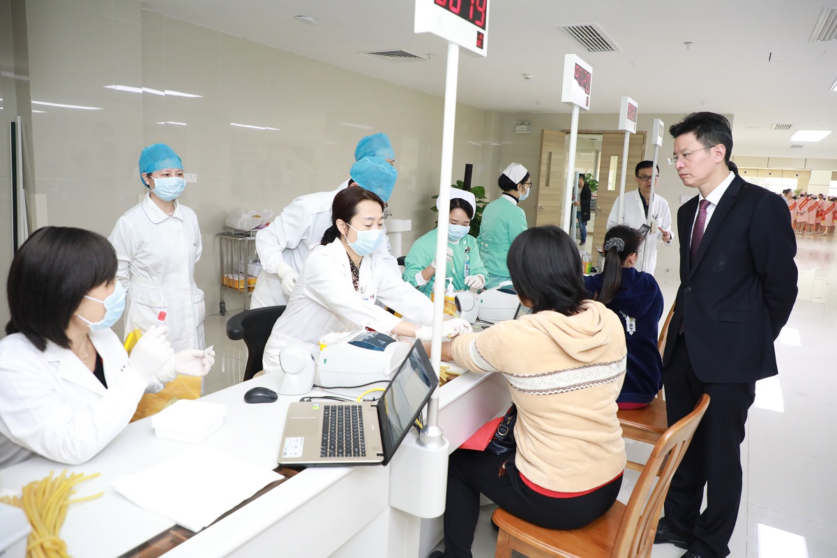 院長(zhǎng)劉瑞林(右一)巡查門診檢驗(yàn)科抽血處。