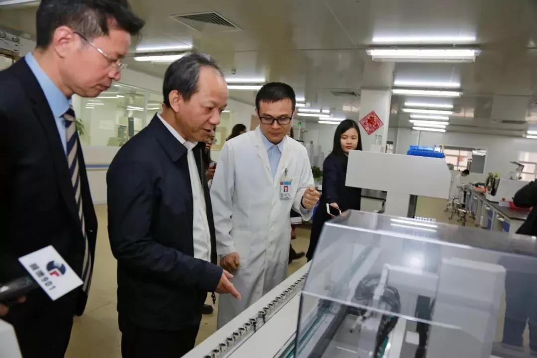 佛山市委常委、宣傳部部長、順德區(qū)委書記郭文海(左二)在新院檢驗科了解順德首條全自動檢驗流水線的投入使用情況。