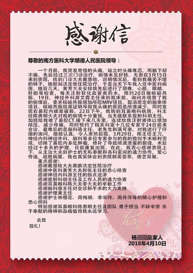 出院當(dāng)天,楊女士及家屬送來了錦旗和感謝信(見下圖),楊女士真誠(chéng)地握著陳勇明主任的手說:“感謝您和醫(yī)院的團(tuán)隊(duì),勇于擔(dān)當(dāng),不辭辛勞,樂奉獻(xiàn),為我驅(qū)除病魔,為人民群眾健康保駕護(hù)航!”