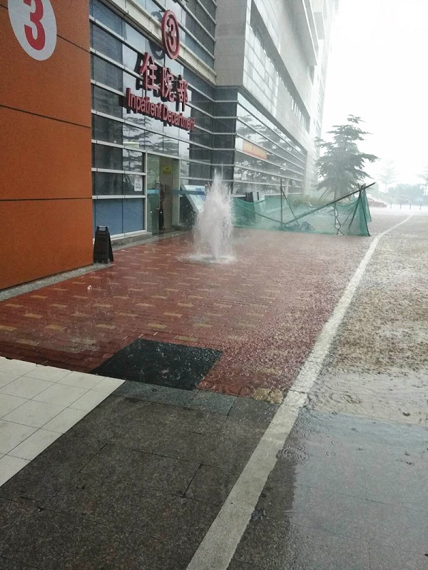 后勤職能部門的葉科、朱朝斌、吳亮等率先與維保單位人員一起到放射科檢查,并爬進天花板上方檢查漏水點,發(fā)現(xiàn)是突降大雨大量雨水排至低層雨水井,2、3號樓外面的雨水排水不暢,導(dǎo)致雨水反流到空調(diào)排氣口,噴出大量雨水,造成放射科護士站配電總箱進水,引起電開關(guān)跳閘,導(dǎo)致多個室間無法正常供電。