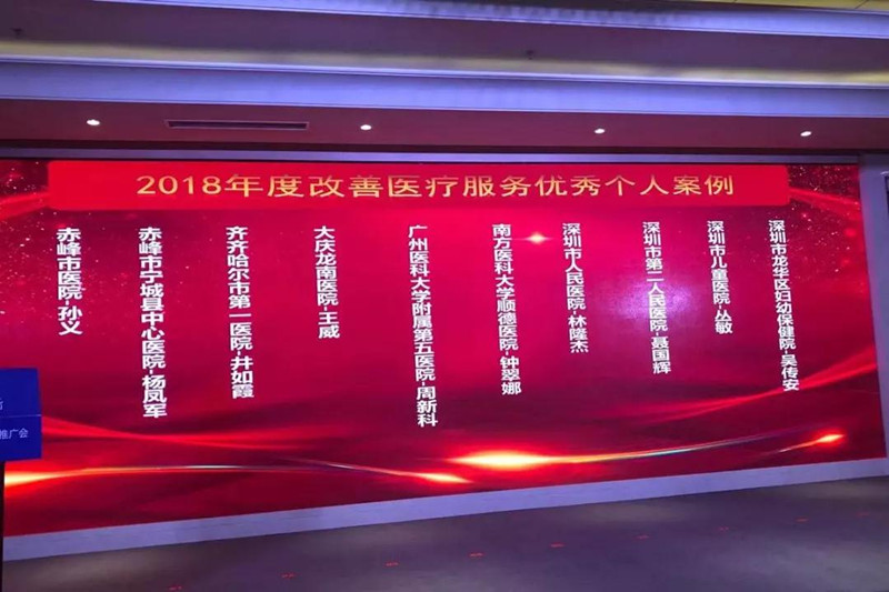 2019年1月6日,由國(guó)家衛(wèi)生健康委員會(huì)醫(yī)政醫(yī)管局、《健康報(bào)》社主辦的“進(jìn)一步改善醫(yī)療服務(wù)行動(dòng)計(jì)劃”——2018年度改善醫(yī)療服務(wù)典型經(jīng)驗(yàn)總結(jié)暨宣傳工作推進(jìn)會(huì)在北京隆重舉行。會(huì)議對(duì)全國(guó)2018年度進(jìn)一步改善醫(yī)療服務(wù)十大重點(diǎn)工作創(chuàng)新示范醫(yī)院、優(yōu)秀醫(yī)院案例、優(yōu)秀科室案例及優(yōu)秀個(gè)人進(jìn)行了表彰。