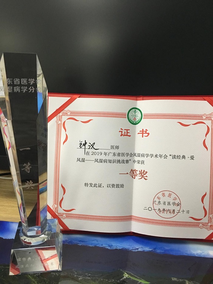 9月20日至22日,廣東省醫(yī)學(xué)會風(fēng)濕病學(xué)學(xué)術(shù)年會在廣州舉行,我院風(fēng)濕免疫科鐘漢在青年醫(yī)師知識競賽中脫穎而出,獲得一等獎。