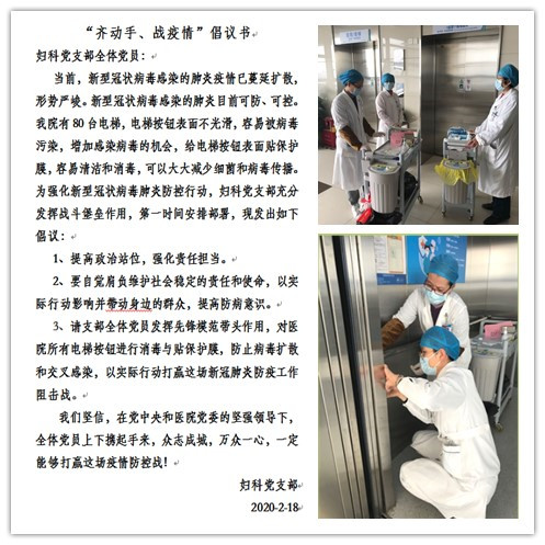 記得2020年2月,新冠肺炎疫情蔓延擴(kuò)散,形勢嚴(yán)峻。婦科黨支部在支部書記郭雪箐的倡議下,為我院80臺電梯按鈕表面貼保護(hù)膜,大大減少細(xì)菌和病毒傳播。加強(qiáng)疫情防控,婦科黨支部充分發(fā)揮戰(zhàn)斗堡壘作用。