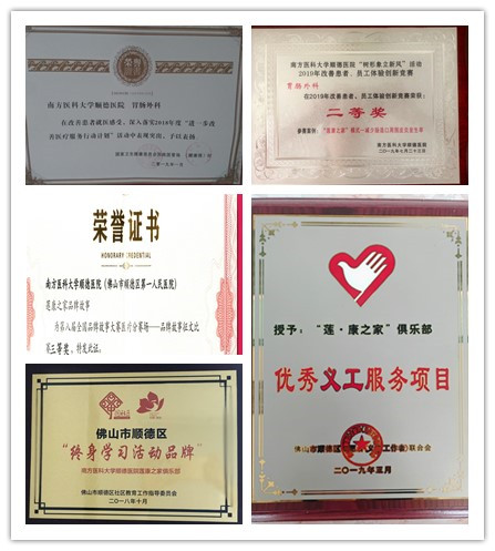 2018年,胃腸外科“蓮康之家”獲得順德區(qū)終身學(xué)習(xí)品牌,2019年,榮獲國(guó)家衛(wèi)健委進(jìn)一步改善醫(yī)療服務(wù)先進(jìn)科室、順德區(qū)優(yōu)秀義工服務(wù)項(xiàng)目等榮譽(yù),2020年,獲全國(guó)質(zhì)量品牌大賽征文三等獎(jiǎng),并成立了院內(nèi)造口傷口培訓(xùn)基地。