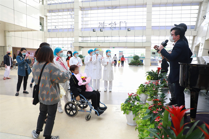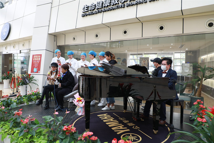 在醫(yī)務(wù)人員的陪伴下,華姐來到門診大堂鋼琴演奏區(qū)。鋼琴演奏和伴唱的志愿者們熱情地為她伴奏,華姐開始了屬于她的“演唱會”。臺上的華姐,笑得特別開心,她說,住院期間,醫(yī)護團隊、生命敘事醫(yī)學中心和醫(yī)務(wù)社工站的共同介入,不但緩解她的疼痛和身體不適,還降低她的精神和心理負擔,生活質(zhì)量也提高不少。一路走來,她特別感謝家人和朋友的包容與照顧,感謝醫(yī)護人員、社工和志愿者的幫助與鼓勵,她想用歌聲答謝曾經(jīng)給予她支持的所有人。一曲未盡又唱一曲,吸引了不少醫(yī)護人員和患者駐足,紛紛為她鼓掌,純凈的笑容、樂觀的精神感染著在場的所有人。