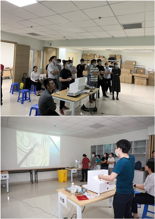 開班儀式上,外科專業(yè)基地主任龍兆麟強調(diào)了練好腔鏡基本技能的重要性及培訓(xùn)學(xué)習(xí)要求,鼓勵學(xué)員努力掌握這門“藝術(shù)”。培訓(xùn)課程由外科專業(yè)基地教學(xué)副主任歐陽滿照主持,胃腸外科多名教師骨干參與,采用“理論引導(dǎo),實操為主,分組訓(xùn)練”的新型模擬帶教模式,操作培訓(xùn)項目主要包含腔鏡下進行持物傳遞(抓豆子)和縫合打結(jié)技術(shù),學(xué)員們積極學(xué)習(xí),輪流實操,得到了充分的動手練習(xí)機會。
