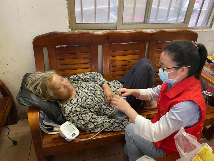 劉玲玲護(hù)士長(zhǎng)為林婆婆測(cè)血壓血糖,給壓瘡換藥