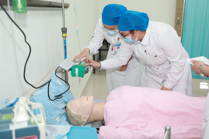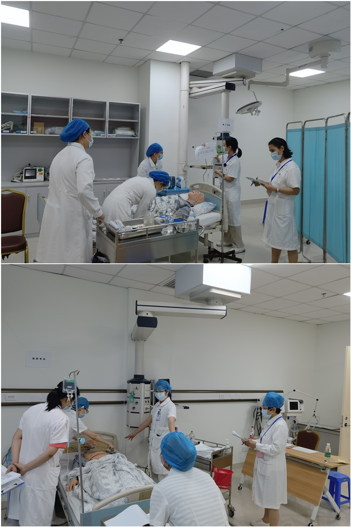 參賽隊伍均由臨床科室護(hù)士長帶領(lǐng)2名護(hù)士組成,運用案例導(dǎo)入、標(biāo)準(zhǔn)病人及家屬提供案例信息,模擬臨床真實情景,考驗選手們對危重患者的病情觀察、突發(fā)情況處置及團(tuán)隊協(xié)作能力,涉及的操作包括吸氧、皮試、心電監(jiān)護(hù)、靜脈輸液、靜脈采血、血糖監(jiān)測、電除顫、心肺復(fù)蘇等護(hù)理技術(shù)。