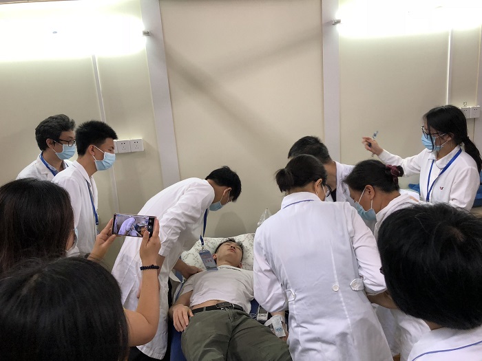 現(xiàn)場模擬一位男士在接種新冠疫苗10分鐘后在留觀區(qū)出現(xiàn)頭暈、胸悶等不適,隨即出現(xiàn)過敏性休克癥狀?,F(xiàn)場巡視人員馬上到場,經(jīng)判斷考慮出現(xiàn)過敏性休克,立即開展救治工作,并通知其余各搶救梯隊(duì)成員立即到場進(jìn)行搶救,隊(duì)員們反應(yīng)迅速,分工明確,操作有條不紊,在搶救患者的同時(shí),安撫好現(xiàn)場其余人員的情緒,及時(shí)、規(guī)范地處理好突發(fā)事件。