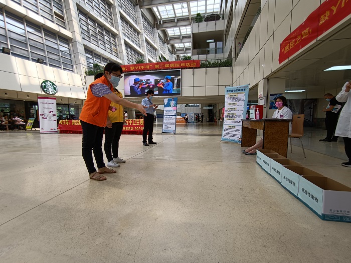 現(xiàn)場(chǎng),門診大廳LED電子屏滾動(dòng)播放手衛(wèi)生宣傳微視頻,醫(yī)院感染管理科工作人員向咨詢?nèi)罕姲l(fā)放手衛(wèi)生宣傳彩頁,還設(shè)置手衛(wèi)生演示、防護(hù)用品正確使用以及醫(yī)療廢物正確分類等感控知識(shí)宣教區(qū)。