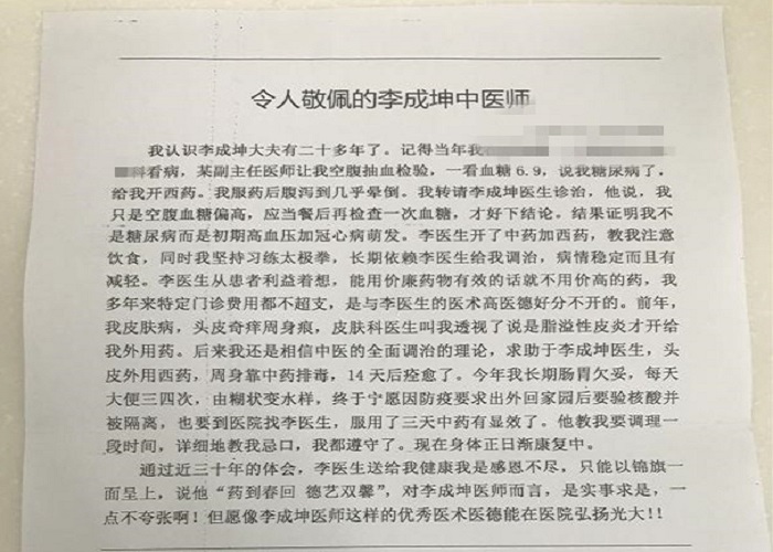 信中描述,多年來在李成坤醫(yī)生的悉心醫(yī)治調(diào)理,使得病情穩(wěn)定好轉(zhuǎn),糖尿病各項指標控制良好,偶有腹瀉、皮膚病等問題也在李醫(yī)生調(diào)理下藥到病除。楊伯感謝李醫(yī)生不僅中西醫(yī)結(jié)合治療,醫(yī)術(shù)精湛,還有處處為患者著想、實事求是的良好醫(yī)德醫(yī)風(fēng)。