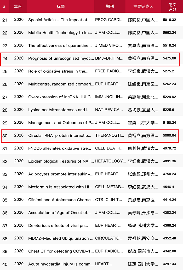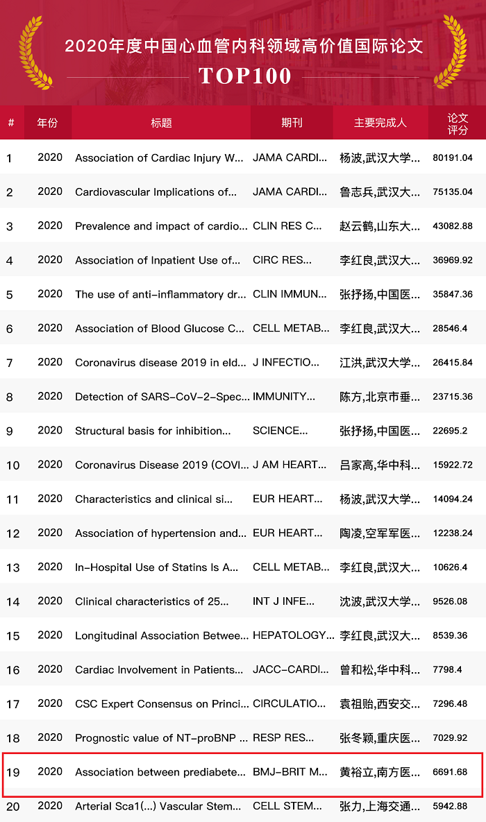近日,“全球?qū)W者庫”發(fā)布了《2020年度中國心血管內(nèi)科領(lǐng)域高價值論文TOP100》排行版。我院心內(nèi)科團隊共有3篇論文登上該榜單,分別位列第19,第24和第30位。
