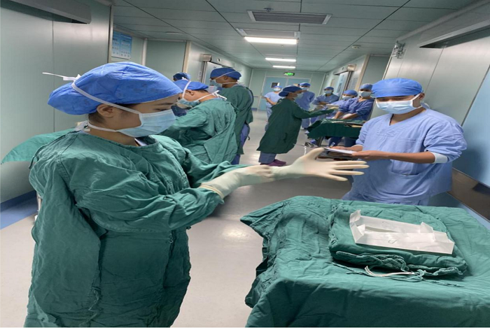 賽中,他們從嚴(yán)格的整理著裝、檢查用物到六步洗手法操作開始,認(rèn)真規(guī)范地進(jìn)行手消毒,隨后,開始穿著無菌手術(shù)衣、無觸式戴手套。參賽者們一絲不茍、嚴(yán)陣以待的競賽態(tài)度更加真實(shí)地體現(xiàn)了手術(shù)室護(hù)士的日常工作狀態(tài),為手術(shù)患者持續(xù)保障一個無菌環(huán)境,預(yù)防手術(shù)部位的感染,不僅是安全醫(yī)療的基本保證,也能最大限度的保證病人及醫(yī)務(wù)人員的安全。