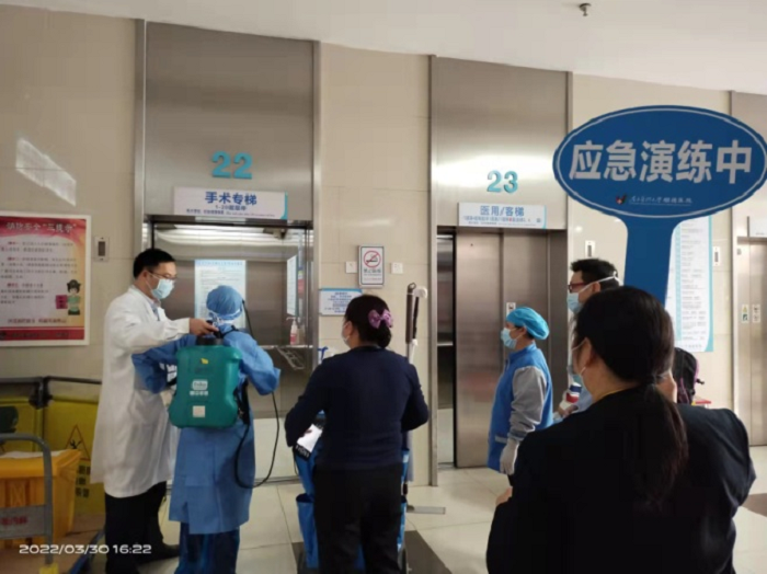當(dāng)前,國內(nèi)新冠肺炎疫情呈多點(diǎn)散發(fā)、局部暴發(fā)態(tài)勢,香港疫情發(fā)展仍處于高位,國內(nèi)本土疫情發(fā)展迅猛,涉及多個地市,疫情防控形勢愈發(fā)嚴(yán)峻。為加強(qiáng)我院新冠肺炎疫情防控消毒處置能力,快速有效控制新冠肺炎院內(nèi)事件,快速切斷傳染病傳播途徑,防范疫情的擴(kuò)散蔓延,最大限度降低新冠病毒院內(nèi)交叉?zhèn)鞑サ娘L(fēng)險,為進(jìn)一步強(qiáng)化電梯消毒責(zé)任意識,總務(wù)科于近期進(jìn)行電梯消毒演練,確保醫(yī)療工作正常運(yùn)行,保證醫(yī)療安全。