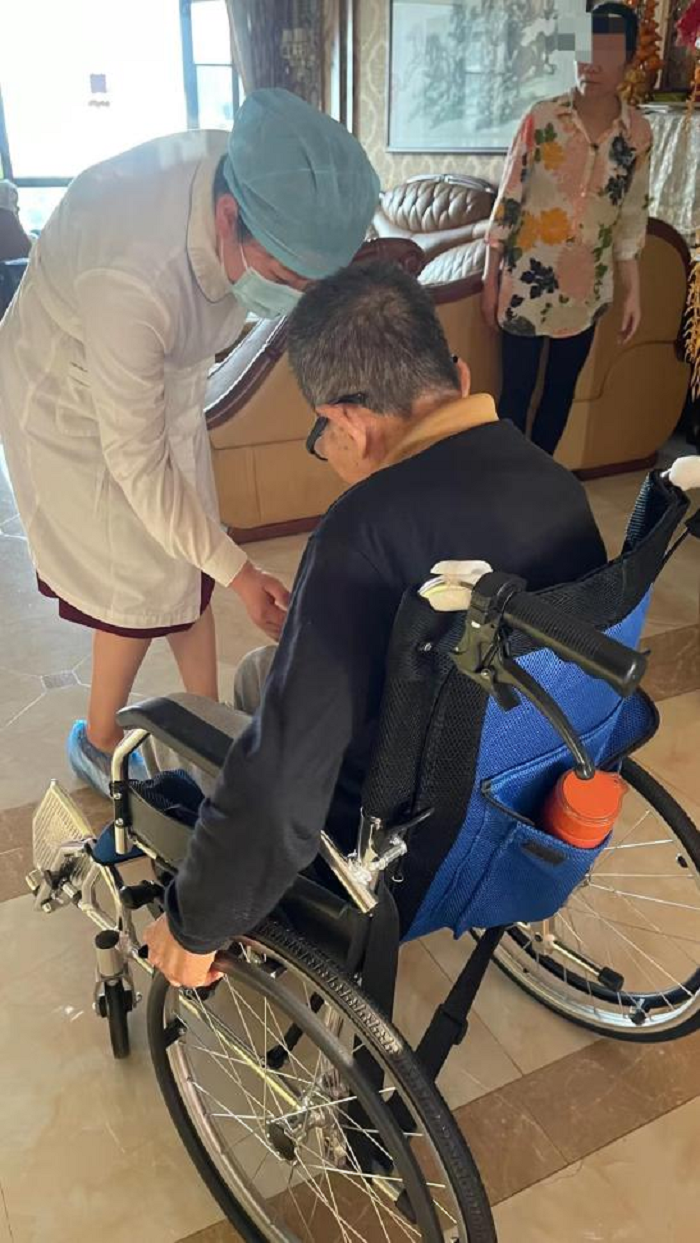 接到訂單后,由職能第七黨支部的護理部陳瓊芳主任護師帶隊,與王貴蓮主管護師一同來到沈爺爺家,在為沈爺爺進行詳細的病情評估,做好準備工作后,她們?yōu)樯驙敔敯纬四蚬?,并和家屬耐心講解了拔除尿管后的的注意事項,同時也根據(jù)患者的身體狀況進行了營養(yǎng)、防跌倒、防誤吸、皮膚護理、輪椅的使用等全方位的居家護理健康教育,爺爺?shù)呐畠赫f:“上門的指導(dǎo)宣教更加貼心,更加直接形象,讓我們也更有信心照顧爸爸了!”