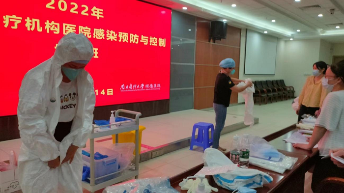 為進(jìn)一步加強(qiáng)我區(qū)醫(yī)療機(jī)構(gòu)感染預(yù)防與控制工作,做好集中隔離場(chǎng)所感控管理工作,提升集中隔離場(chǎng)所管理水平,強(qiáng)化集中隔離場(chǎng)所工作人員業(yè)務(wù)能力,4月14日,順德區(qū)醫(yī)院感染管理質(zhì)量控制中心聯(lián)合順德區(qū)疾病預(yù)防控制中心,在南方醫(yī)科大學(xué)順德醫(yī)院學(xué)術(shù)報(bào)告廳舉辦《2022年順德區(qū)醫(yī)療機(jī)構(gòu)醫(yī)院感染預(yù)防與控制培訓(xùn)班》,各鎮(zhèn)(街道)衛(wèi)生健康辦公室院感管理工作負(fù)責(zé)人、順德區(qū)醫(yī)院感染管理質(zhì)量控制中心各成員、順德區(qū)集中隔離場(chǎng)所感控督導(dǎo)和防控消毒相關(guān)后備人員參加現(xiàn)場(chǎng)培訓(xùn)考核和實(shí)踐操作。