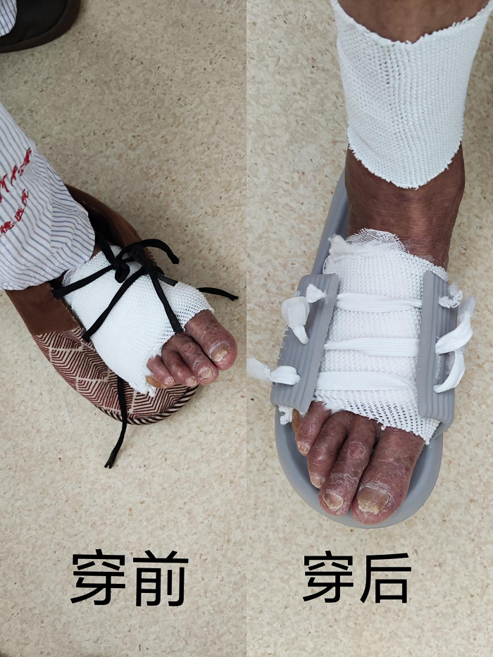 陳叔就有這樣的苦惱。他就是一位足部潰瘍的患者,足部需要敷料包著,在一次查房與陳叔交談時,發(fā)現(xiàn)因為敷料包裹的原因,有一只腳根本穿不進(jìn)鞋子,只能踩在鞋子上然后用鞋帶綁住腳行走,行走很困難,陳叔表示“真的很是煩惱但不知如何解決”。