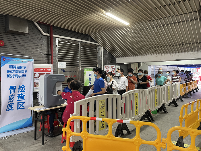 現(xiàn)場(chǎng),來自南方醫(yī)科大學(xué)順德醫(yī)院、容桂社區(qū)衛(wèi)生服務(wù)中心、容桂街道辦、以及居委會(huì)的醫(yī)務(wù)人員和義工共約100名,在做好新冠疫情有效防控的前提下,容桂街道的居民在簽署知情同意書后,有序進(jìn)入調(diào)查現(xiàn)場(chǎng),享受免費(fèi)提供的價(jià)值近2000元的檢查項(xiàng)目。這些檢查項(xiàng)目包括:有糖尿病診斷金標(biāo)準(zhǔn)之稱的口服糖耐量試驗(yàn)、血常規(guī)、肝腎功、甲狀腺功能、血糖、血脂、胰島素、糖化血紅蛋白、微量元素等檢驗(yàn)項(xiàng)目,以及血壓檢測(cè)、身體測(cè)量、骨密度檢測(cè)、尿微量白蛋白檢測(cè)、脂肪肝檢測(cè)、甲狀腺彩超及頸部血管彩超檢查。