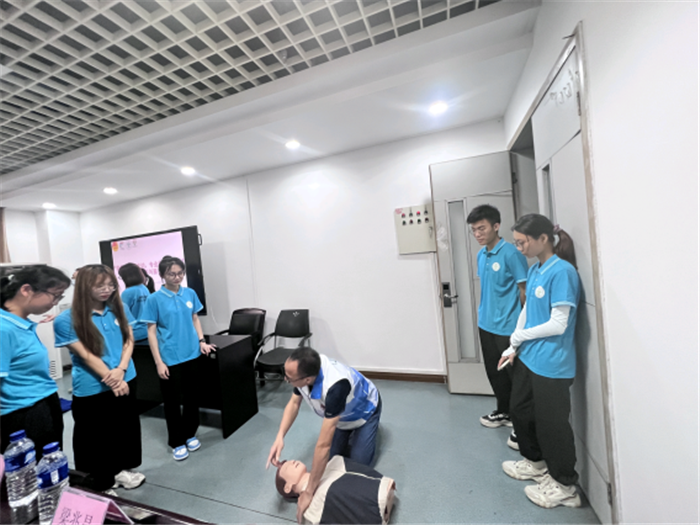 首先,雷佳璇、陳嘉怡兩位號(hào)手給同學(xué)們發(fā)放了急救包與手冊(cè),并介紹了詳細(xì)的使用方法。隨后,黃明福與牛斌老師采用理論知識(shí)講解和實(shí)際操作相結(jié)合的方式,對(duì)心肺復(fù)蘇、海姆立克急救法和常見意外傷害處理三項(xiàng)內(nèi)容進(jìn)行了系統(tǒng)講解。同時(shí),他們還結(jié)合人體模型進(jìn)行現(xiàn)場(chǎng)演示,并一對(duì)一指導(dǎo)同學(xué)進(jìn)行操作講解和示范。通過分步驟示范,手把手教學(xué),力求讓現(xiàn)場(chǎng)每一位同學(xué)都能熟練掌握。
