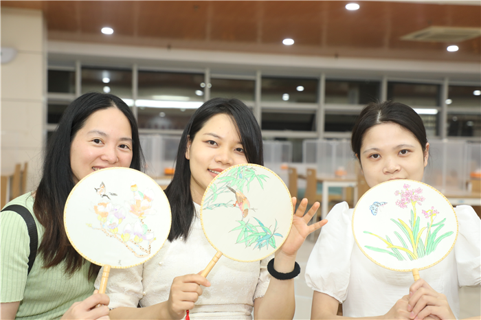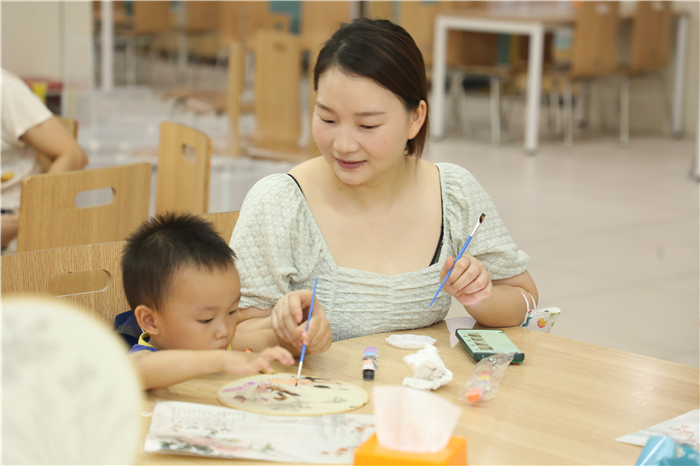 游園晚會(huì)還安排了中秋傳統(tǒng)燈籠和團(tuán)扇的制作活動(dòng),大家執(zhí)起手中彩筆,在宣紙上用水彩顏料描于扇面上,通過(guò)妙心巧手,原本素白的扇面漸漸被點(diǎn)綴,一幅幅清新淡雅的團(tuán)扇作品便呈現(xiàn)在眼前。中秋佳節(jié)夜,墨潤(rùn)團(tuán)扇搖佳人。