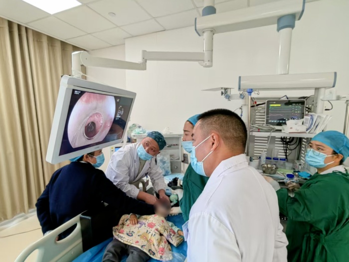 一場(chǎng)精心準(zhǔn)備的手術(shù)迅速展開。為確保萬無一失,正在劍河縣人民醫(yī)院幫扶、掛職消化內(nèi)科主任的南醫(yī)八院(佛山市順德區(qū)第一人民醫(yī)院)消化內(nèi)科副主任何順輝與當(dāng)?shù)蒯t(yī)院的消化內(nèi)科副主任黃香聯(lián)合進(jìn)行手術(shù)操作。麻醉科主任陶著則為這名幼小的患者制定了周密的麻醉方案,并全程監(jiān)護(hù),為手術(shù)的成功提供了至關(guān)重要的生命支持。