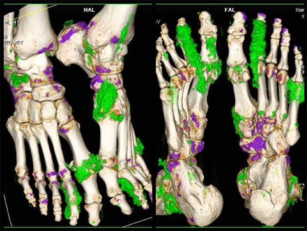 雙能源CT雙能量檢查結(jié)石顯而易見:顯示以綠色標(biāo)記尿酸鹽在關(guān)節(jié)周圍沉積,紫色標(biāo)記為骨質(zhì)硬化區(qū)。