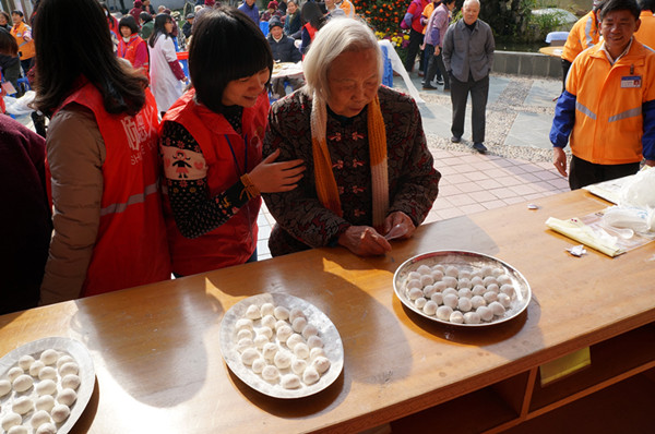 下午2點30分,“天使之翼”義工們便來到敬老院,得知我院“天使之翼”義工服務隊陪他們搓湯圓度元宵,老人家們個個都喜笑顏開。搓湯圓,是元宵節(jié)的必備節(jié)目,也是一項很講究的傳統(tǒng)手藝,在這方面,老一輩們好像更有心得,糯米團、餡料一上,他們就迫不及待的“搓”起來。老人們雖然年近花甲,但搓起湯圓來手腳利落、有模有樣,不時還當起師傅,一邊搓一邊教旁邊的義工。與老人們的手藝相比,我們的隊員比較有“特色”:大的、小的、橢圓的、露餡的,甚至還有像烏龜?shù)?、像雪人的,應有盡有,逗得老人們哈哈大笑。伴隨著新春的樂曲和席間的歡聲笑語,盤子放滿了大家親自搓的湯圓,“大珠小珠落玉盤”,看著自己的勞動成果,大家都充滿了成就感!
