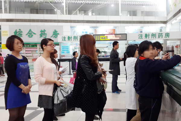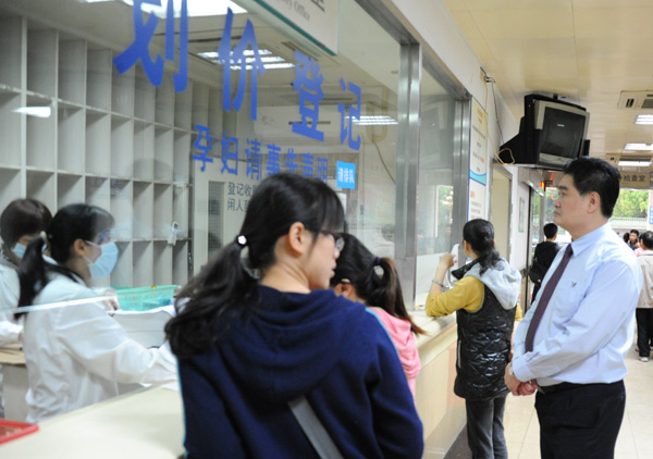 陳院長(zhǎng)(右一)在內(nèi)科分診臺(tái)前查看自己的就診信息。 |