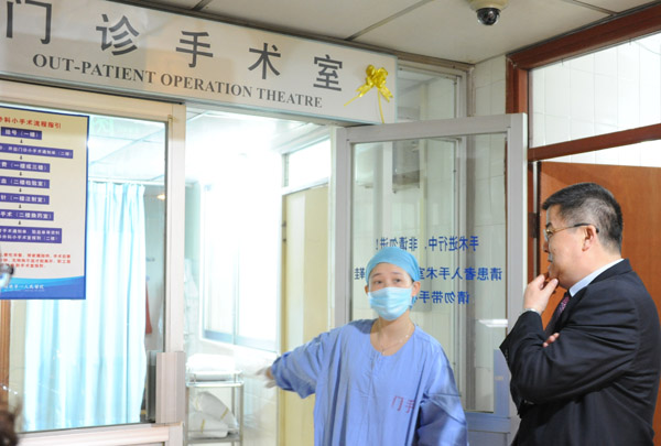 錢江副院長(zhǎng)(右)體驗(yàn)門診手術(shù)就診流程。 |