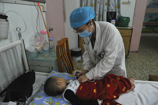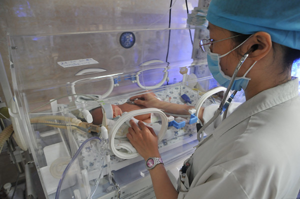 在新生兒區(qū),醫(yī)務(wù)人員時刻觀察患兒情況。