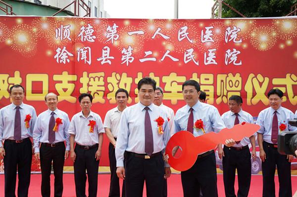 5月9日,艷陽高照,我院向?qū)趲头鰡挝恍炻効h第二人民醫(yī)院捐贈救護車儀式在徐聞縣第二人民醫(yī)院籃球場隆重舉行。順德區(qū)衛(wèi)生和計劃生育局常務(wù)副局長何建民、徐聞縣副縣長陳光力、徐聞縣衛(wèi)生局相關(guān)領(lǐng)導(dǎo)、我院院長陳小伍、副院長龍兆麟、朱達堅、院長助理伍錦浩、我院義診專家及徐聞縣第二人民醫(yī)院全體中層及以上干部出席了捐贈儀式。儀式由徐聞縣第二人民醫(yī)院黨委副書記吳有智主持。
