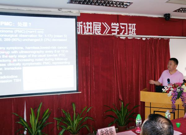 我院病理科主任康凱夫教授、功能科馬洪主任醫(yī)師、普外二區(qū)梁智強主任醫(yī)師、馮劍平副主任醫(yī)師、吳路楊主治醫(yī)師也分別就分化型甲狀腺癌的病理診斷及進(jìn)展、甲狀腺癌的超聲表現(xiàn)、“結(jié)扎速”在甲狀腺葉切除術(shù)中的應(yīng)用、頸淋巴結(jié)分區(qū)及分化型甲狀腺癌頸淋巴結(jié)清掃術(shù)式、甲狀腺乳頭狀癌術(shù)后復(fù)發(fā)侵犯氣管行甲癌聯(lián)合氣管切除等甲狀腺癌的基礎(chǔ)及臨床熱點問題做了學(xué)術(shù)報告。