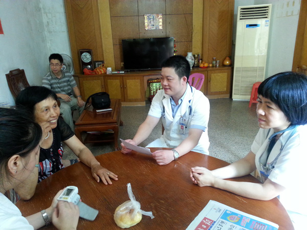 參加此次義診活動的有耳鼻喉科、心血管內(nèi)科、呼吸內(nèi)科、腎內(nèi)科、康復(fù)科、內(nèi)分泌科、普外科等專科醫(yī)生及藥劑、護理人員。工作人員剛做好準(zhǔn)備工作,測血壓、血糖的地方便圍滿了前來測量的群眾,工作人員一邊細心為群眾測量、一邊耐心講解相關(guān)注意事項,當(dāng)發(fā)現(xiàn)一位群眾的空腹血糖高達26.7mmol/L時,工作人員高度重視,經(jīng)過詢問發(fā)現(xiàn)他從未監(jiān)測過血糖,對糖尿病也一無所知,便向其詳細講解糖尿病相關(guān)知識,建議進一步檢查。義診中,普外科張炎祥醫(yī)生的一位出院患者本打算今天復(fù)診,在得知張醫(yī)生在此義診,專程趕來讓張醫(yī)生診治。在義診間隙,部分醫(yī)生在衛(wèi)計局領(lǐng)導(dǎo)及村干部的帶領(lǐng)下上門走訪了兩位長期患病的群眾。一位是癌癥術(shù)后長期臥床患者,另一位是因尿酸高長期服藥的患者,通過詢問和檢查,醫(yī)生對患者的飲食及日常生活注意事項進行了詳細講解,對患者的下一步用藥給了建議,并鼓勵患者及家屬戰(zhàn)勝疾病的信心。