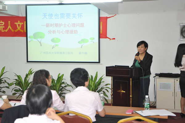 啟動儀式后,我院邀請了廣州醫(yī)學院第三附屬醫(yī)院翟巾幗、南方醫(yī)科大學護理學院陳瑜兩位教授進行有關護士心理健康的專題講座。