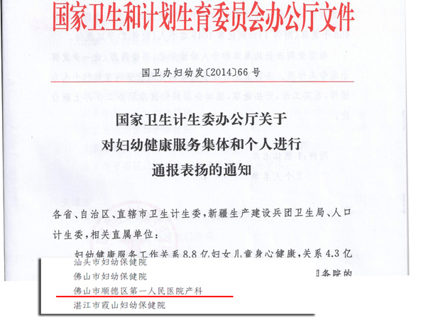近日,國家衛(wèi)生和計(jì)劃生育委員會(huì)對全國403個(gè)在婦幼健康服務(wù)工作中表現(xiàn)突出的集體進(jìn)行了表彰,我院產(chǎn)科成為佛山市僅有的兩家受表彰的集體之一,也是順德區(qū)唯一獲得此項(xiàng)榮譽(yù)的集體。