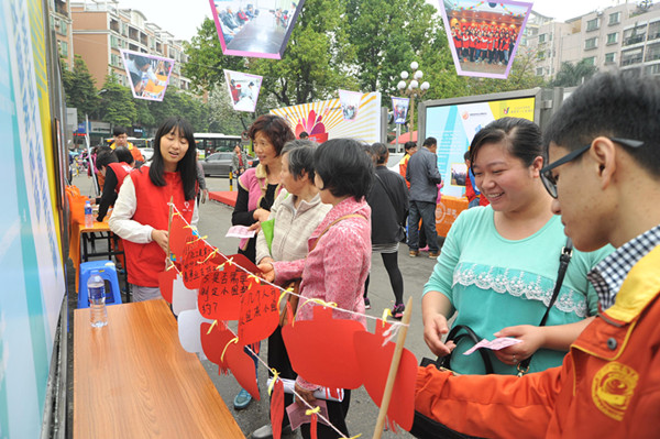 活動(dòng)當(dāng)日,順德區(qū)衛(wèi)生和計(jì)劃生育局代表潘燕勛、順德第一人民醫(yī)院工會(huì)副主席謝健群、順德社會(huì)服務(wù)聯(lián)會(huì)會(huì)長(zhǎng)朱月霞、順德區(qū)社會(huì)工作者協(xié)會(huì)會(huì)長(zhǎng)凌遠(yuǎn)清以及順德區(qū)星宇社會(huì)工作服務(wù)中心總干事吳子堅(jiān)為“社工有愛(ài),醫(yī)路同行”的活動(dòng)進(jìn)行了啟動(dòng)儀式?;顒?dòng)設(shè)有各種宣傳展示攤位,配合各種小游戲,讓市民在有趣的游戲中了解社工。現(xiàn)場(chǎng)參與者熱情高漲,每個(gè)攤位都十分火爆,尤其是“猜燈謎”、“幸運(yùn)大轉(zhuǎn)盤(pán)”、“社工知識(shí)加油站”“心愿樹(shù)”等。有個(gè)市民表示“之前一直在醫(yī)院看病都沒(méi)有遇過(guò)這些活動(dòng),偶爾有這樣的活動(dòng)真好,有得玩又有禮品,心情也好點(diǎn),我還真的第一次知道醫(yī)院有社工呢。”現(xiàn)場(chǎng)還設(shè)有音樂(lè)攤位,大家為愛(ài)發(fā)聲,用歌聲傳播正能量。